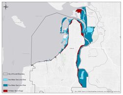 Sea level rise prediction to determine area landcover in Everett, WA that would be impacted by 1 meter (SLR), 5 meter (SLR) & 10 meter storm surge and how that would impact structures, transportation network, and wetlands.